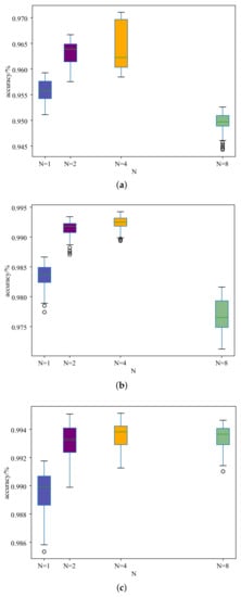We chose different values, 1, 2, 4, and 8, for N to discuss the influence on the MSTAR data set. We conducted experiments under the conditions that the number of labeled samples in each category were 10, 20, 40, and 60. At the same time, we strictly ensured that other parameters remained unchanged when conducting the experiments. The experimental results are shown in Table 5, and the boxplots of the recognition accuracy with different labeled samples per category are shown in Figure 10.