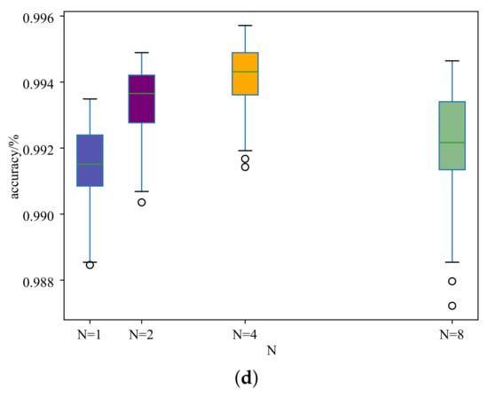 Boxplots of the recognition accuracy of different N values under different labeled samples in each category on the MSTAR data set. (a) 10; (b) 20; (c) 40; (d) 80.