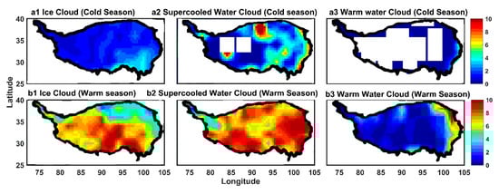 Total cloud fraction and RCF for ice clouds, mixed-phase clouds, warm water clouds, supercooled water clouds, and multilayered clouds during the cold and warm seasons over the TP are shown in Figure 1a–c. The total cloud fraction at a given grid-box is defined as the ratio of the number of cloudy profiles to the number of all sample profiles, while the RCF for each cloud phase is calculated based on the Equation (1). Our results indicated that total clouds occurred more frequently during the warm season than during the cold season, especially in the southeastern part of the TP (Figure 1(a1–a3)). A low value (approximately 36%) of total cloud fraction over the southwestern part of the TP appeared during the cold season (see Figure 1(a1)) [78]. Ice clouds (Figure 1(b1,b3)) were recorded to have a high RCF value (even >84%) during the cold season, being recorded over most regions of the TP; these clouds had considerable seasonal variability, except for the southeastern area of the TP. Compared with ice clouds, a relatively small value (<20%) and weak seasonal variation of the RCF of warm water clouds were found over the TP (Figure 1(c1,c3)).