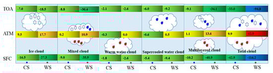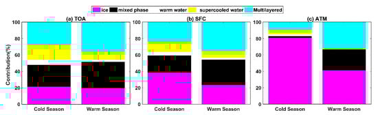 Our results indicate that differences in the CRE between the cold and warm seasons in the ATM was evident. It is also found that warm water and supercooled water clouds during the cold season have a weak cooling effect in the ATM, approximately −0.3 Wm−2 and −0.6 Wm−2, respectively. However, clouds generally heat the ATM during the warm season. Results in Figure 5 indicate that the stronger cloud heating effect in the ATM during the warm season is mainly caused by the ice, mixed-phase, and multilayered clouds, whereas liquid clouds contribute less heating or cooling effects. Besides, the cloud cooling effects at the TOA and SFC for different cloud phases were higher during the warm season compared with that during the cold season.