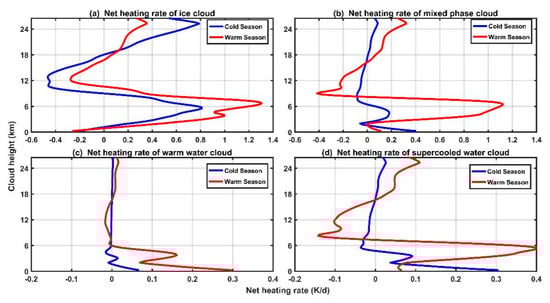 Results for single-layer mixed-phase clouds (Figure 7b) indicated that mixed-phase clouds recorded a relatively smaller heating rate compared with ice clouds. The relatively weaker heating effect (~1.1 K/day) corresponds to a smaller CRE within the atmosphere (Figure 5). Similar to ice clouds, mixed-phase clouds during the warm season also recorded a cooling tendency on the middle-level atmosphere (9–16 km), having a stronger effect (up to −0.4 K/day). On the contrary, the mixed-phase cloud heating rate during the cold season recorded a weak heating effect at low altitudes. Compared with the ice clouds and mixed-phase clouds, the heating rate of the liquid clouds was smaller at the high-level atmosphere due to lower occurrence frequencies. In addition, warm water clouds at low altitudes also recorded a very weak heating effect (<6 km), especially during the cold season (heating rate <0.1 K/day). Compared with warm water clouds, supercooled water clouds recorded a stronger heating effect with altitudes lower than 6km (~0.4 K/day), and a stronger cooling effect in the mid-level atmosphere (~−0.15 K/day) during the warm season. Overall, differences in the heating rate profiles between different cloud phases during different seasons were mainly controlled by the vertical distribution of the cloud phase and their microphysical, macrophysical, and optical properties. As the important components of mixed-phase clouds, altocumulus and altostratus, for example, have different cloud radiative effects and heating rates due to differences in the dominant cloud phases [95].