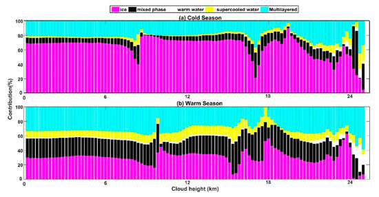 The fraction of the liquid water clouds also recoded a significant increase under multilayered cloud conditions during the warm season (Figure 4). Compared with single-layer conditions, it is also noteworthy that the proportions of liquid cloud and mixed-phase clouds are similar during all seasons under multilayered cloud conditions [78]. Furthermore, our result further demonstrates that the fraction of supercooled water clouds was higher than that of the warm water clouds over the TP.