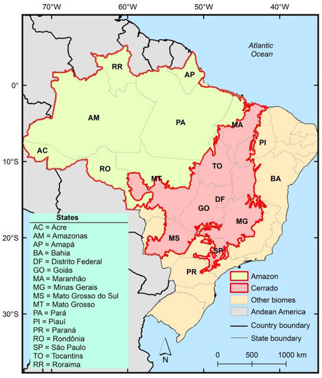 Location of the study areas (Amazon and Cerrado biomes) in the northern and central parts of Brazil. Amazon biome corresponds to the tropical rainfall forest and Cerrado biome corresponds to the tropical savannah. “Other biomes” in the legend correspond to the Caatinga (semi-arid), Atlantic Forest (coastal forest), Pampa (grasslands), and Pantanal (wetlands) (boundaries not shown in the figure). Source: [27].