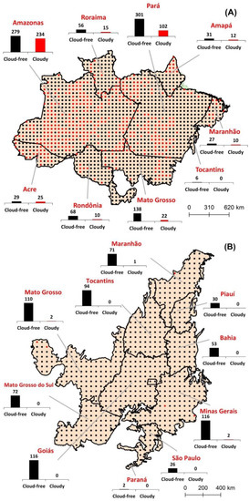 Landsat 8 OLI image sampling points per state predicted by the sampling design (confluence of 0.5 × 0.5 degree regular grid) and corresponding number of cloud-free Landsat 8 OLI images in the Amazon (A) and Cerrado (B) biomes. Red circles are the sampling sites without cloud-free images. Total number of cloud-free image sampling points: 929 for the Amazon biome and 690 for the Cerrado biome.