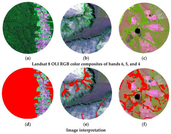 Examples of Landsat 8 OLI RGB color composites (a–c) and corresponding image interpretation (d–f) from the municipalities of Nova Mamoré/Rondônia (Amazon biome) and from the municipalities of Mateiros/Tocantins and São Miguel do Araguaia/Goiás (Cerrado biome), respectively. Red areas correspond to the forest class.