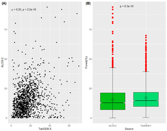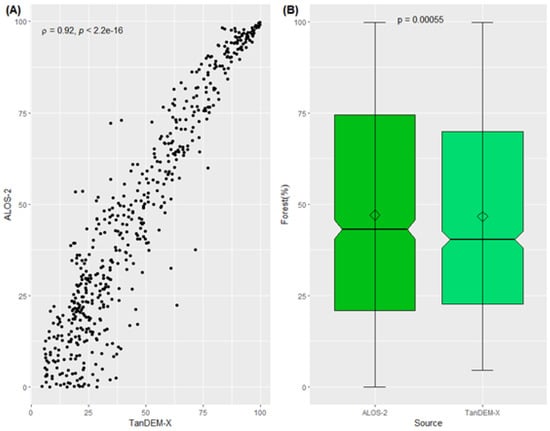 Relationship between the percentage of forest estimations obtained by the TanDEM-X and ALOS-2 data sets (A) and the results of the Wilcoxon test (B) over the Amazon biome at the municipality level.