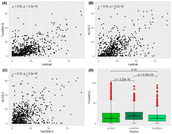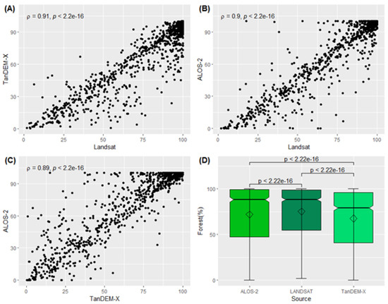 Relationship between the percentages of forest estimations obtained by the TanDEM-X, ALOS-2, and Landsat 8 OLI image interpretation (A–C) and the results of the Wilcoxon test (D) over the Amazon biome at the local level (image samples).