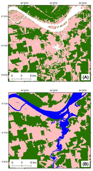 The dominant forest classes present in the Amazon biome are the primary rainfall forest often subdivided in dense, mixed, and open perennial forests as well as the mangroves found in the coastal region of Amapá, Maranhão, and Pará [53]. These forest formations present relatively little spectral and radiometric confusion in both optical and SAR satellite images with respect to the following other representative LULC classes present in this biome: savannah-like formations mostly found in large spots in the states of Amapá and Roraima [54]; extensive pasturelands for cattle beef production mostly found in the states of Mato Grosso, Pará, and Rondônia [55]; highly mechanized grain production in the Amazon/Cerrado ecotone region in the Mato Grosso State [56]; and the mosaic of grass, shrub, and trees found in the lowlands along the Tocantins/Araguaia River basin in the border of the states of Tocantins and Pará [57].