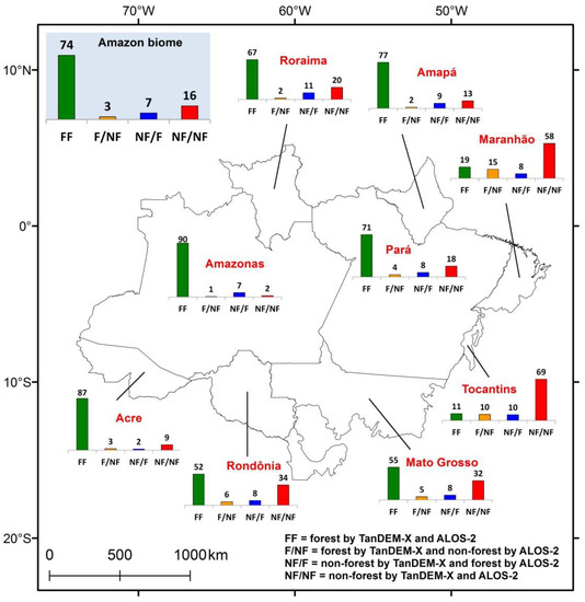 Percentage of pixels classified by the TanDEM-X and ALOS-2 as: forest (FF); non-forest (NF/NF); forest and non-forest (F/NF); and non-forest and forest (NF/F) over the states covered by the Amazon biome.