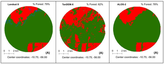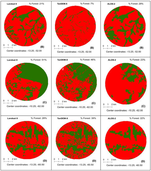 Examples of forest estimations obtained by the TanDEM-X and ALOS-2 data sets over the Amazon biome showing cases of TanDEM-X forest underestimation in the municipalities of Nova Canaã do Norte (A) and Canarana (B), Mato Grosso State, as well as cases of ALOS-2 forest underestimation in the municipalities of Vale do Paraíso (C) and Colorado do Oeste (D), Rondônia State. The corresponding forest estimations from Landsat 8 are shown in the first column. Green = forest; red = non-forest; blue = water body.