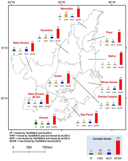 Seven percent of Cerrado pixels were classified as forest by the TanDEM-X and ALOS-2, while 73% were classified as non-forest (Figure 13). The remaining 20% were classified as forest by only one SAR sensor (either TanDEM-X or ALOS-2). The states of Maranhão and Mato Grosso presented the highest percentage of forests discriminated by only one SAR sensor (29% and 23%, respectively). Some states (e.g., Maranhão and Piauí) presented more pixels classified as forest by the TanDEM-X, while other states (e.g., Mato Grosso and Mato Grosso do Sul) presented more pixels classified as forest by the ALOS-2.