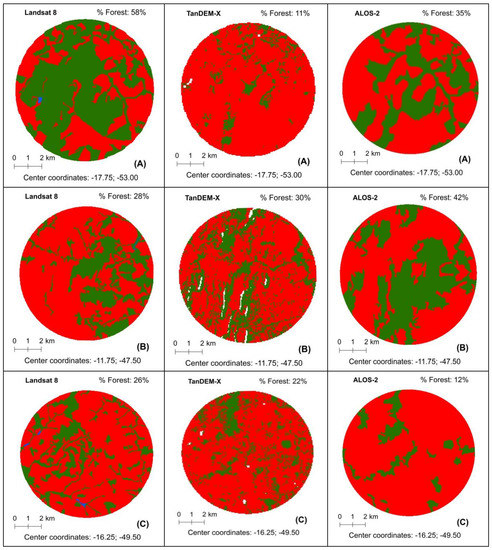 Opposite to the Amazon biome, poor relations were found for the Cerrado (ρ = 0.52 for TanDEM-X; and ρ = 0.54 for ALOS-2). The critical point here is that the accuracy of the classification always depends strongly on the accuracy of the used reference data for training the algorithm. In the case of the TanDEM-X FNF map, three different references, one for tropical forests, one for temperate forests, and one for boreal forests were considered to generate the global product. In the case of ALOS-2 FNF map, 15 references from different countries were considered, as mentioned previously. None of these two products included highly seasonal savannahs in the training areas, which certainly contributes for the reduction of reliability in classifying sparse forests. In this specific case, we observed a probability of TanDEM-X and ALOS-2 forest map cover to be equal at the sampling scale (p-value = 0.16). However, both TanDEM-X and ALOS-2 forest maps were statistically different from Landsat. Also, the probability of the Landsat to estimate forest cover was higher than those from TanDEM-X and ALOS-2.
