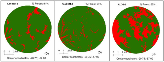 For illustration purposes, Figure 14 shows cases where the estimations of forest cover by TanDEM-X were lower than those from the ALOS-2 and vice-versa. In Figure 14A, forest corresponds to large areas of reforestation, some of them harvested during the Landsat 8 overpass. ALOS-2 detected more areas of reforestations; however, none of the SAR systems were able to detect harvested areas. This is one of the most difficult tasks in discriminating reforestation using fully automatic procedures since harvested areas can be classified as reforestation mainly based on contextual analysis, regardless of the satellite system. When the forest fragments are relatively large, we can note that ALOS-2 was able to depict more areas of forests (Figure 14B); however, when the forests are more fragmented, TanDEM-X was more efficient to depict those areas (Figure 14C). In Figure 14D, ALOS-2 missed a significant portion of forested areas. Both SAR-derived FNF maps did not depict the water reservoir showed in the blue color in the eastern part of the Landsat 8 RGB color composite (Figure 14A).