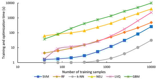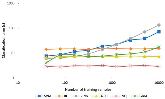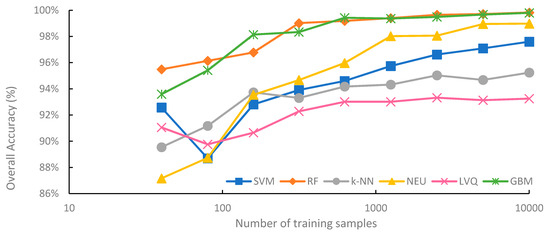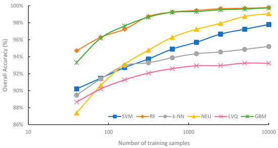 After the optimal parameters for each classification were estimated (Table 6), classifications were conducted for all six machine-learning classifiers (SVM, RF, k-NN, NEU, LVQ, GBM) trained from each of the nine different sets, which varied in sample size (40, 80, 159, 315, 626, 1250, 2500, 5000, 10,000 training samples).