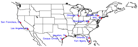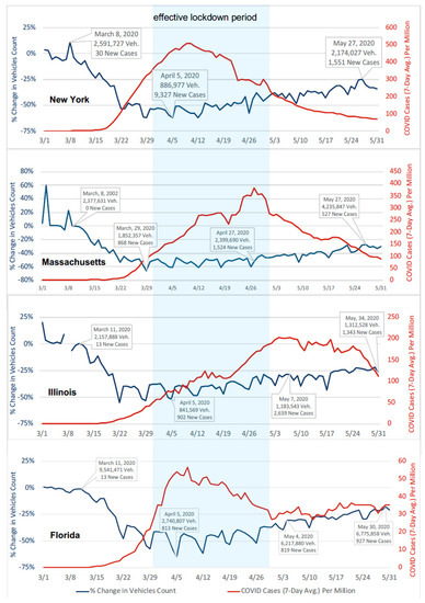 The Federal Highway Administration (FHWA) directs state departments of transportation to provide annual traffic statistics [29]. State transportation agencies are responsible for building, operating, and maintaining permanent traffic monitoring stations to collect a variety of traffic statistics, including traffic count information. Continuous count stations collect hourly traffic counts throughout the year to meet the federal requirements of the National Highway Performance Monitoring System (HPMS). The states analyzed in this study have made their traffic information available through their websites (NY), through data requests (FL), or third-party vendors (IL and Massachusetts (MA)). Bidirectional hourly traffic counts were collected, cataloged, and processed from hundreds of telemetric monitoring stations. The data were reviewed for errors. A common error was missing data and/or sites reporting zero values. The zero values were attributable to road closures because of incidents, scheduled maintenance work, and malfunctioning roadway sensors. Sites with three or more consecutive observations of zero values were removed. We also used available literature to investigate the traffic volume for California [30].