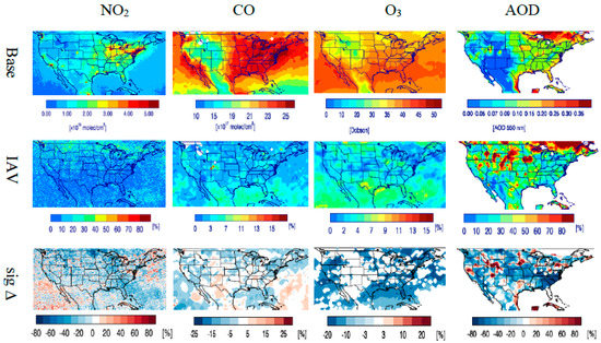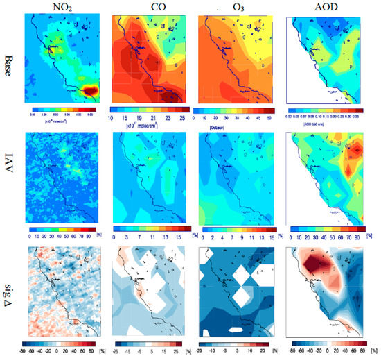 Top panel: Mean pollutant levels during the base period (Base); Middle panel: detrended Interannual Variability (IAV) of the base period; Bottom panel: Significant relative change (sig