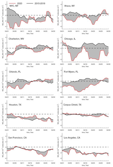 Chicago, IL is a hot spot for traffic and industrial emissions and regularly experiences pollution events [66,67]. Traffic volume in the Chicago region, which includes the “collier” counties of Chicago: Cook, DuPage, Kane, Lake, McHenry, and Will, accounted for ~46% of the traffic volume in the state of Illinois on March 11. The reduction in traffic volume, compared to 2019, was ~50%, similar to that of the state of Illinois. In Chicago, NO2 IAV varied by ~15%, and the NO2 relative change increased during the lockdown by ~20%, i.e., only ~5% beyond the IAV. The increase of NO2 during the pandemic indicates a pollution event that caused a slight increase in NO2 despite the reduction in traffic volume, which implies that the NO2 could have been higher without the lockdown and reduction in traffic volume during this time of the year. Although relatively small, the increase in NO2 also indicates high-NOx conditions. Furthermore, the small increase of NO2 over Chicago was very central, and the city center was surrounded by regions where NO2 was reduced (see Figure 7), and therefore cannot be reflected in the time series of the IAV in Figure 5, which covers a large 1° box around the city center. No effective reductions (ETR 0 in NO2 could be seen in Wisconsin or Indiana as well, given their higher IAV.