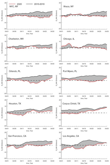 In FL, using ground-based measurements, [27] found a reduction in NO2, CO, and O3 but an increase in SO2 and PM2.5 during the first two weeks of April, which they related to increased power consumption during the lockdown period. In NYC, while [18] found no significant differences, [14,28] found a significant reduction in NO2 and O3 in both NYC and FL.