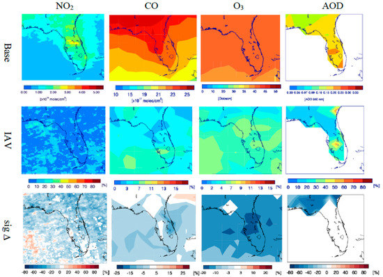Similar to CO, ozone IAV was lower than that of NO2 and was slightly higher in the east, especially over FL (~7%) compared to the west (~3%). The low variability of ozone was due to the presence of significant ozone background levels over the US [54]. The relative reduction (sig ) in O3 due to the pandemic is most significant in the eastern US, including FL (Figure 3).