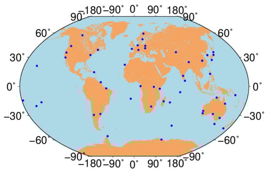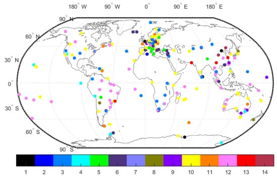 Overview of the experimental multi-GNSS experiment (MGEX) and International GNSS Monitoring and Assessment System (iGMAS) stations. Different colors denote receivers from different manufacturers corresponding to the first column in Table 3.