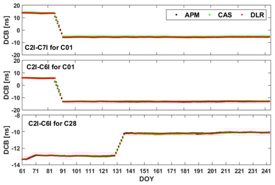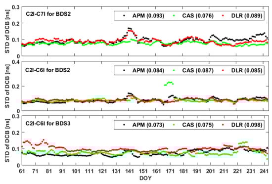 To understand the stability of APM-based BDS satellite DCB estimates, the time series of the weekly STDs of the C2I-C6I and C2I-C7I DCB estimates during the test period are first calculated. As shown in Figure 3, abnormal variations occurred in the BDS DCB estimates for the PRN C01 and C28 satellites, indicating that the satellite DCBs are not always stable enough. The abnormal weekly mean DCB estimates for the PRN C01 satellite during the periods from DOY 084 to 097 can be attributed to the decreased DCB values of satellite C01 on DOY 091. Obvious jumps in the weekly mean DCB time series shown at the bottom of Figure 3 can be attributed to the DCB variation on DOY 135 for the PRN C28 satellite. Apart from the two obvious jumps in the weekly mean DCB time series shown in Figure 3, DCB estimates for the two satellites appear to be rather stable. The weekly STD values for satellites except PRN C01 and C28 are plotted in Figure 4. The maximum values of the STDs of the DCB estimates obtained from APM, DLR and CAS are 0.17, 0.15 and 0.23 ns, which shows the consistency of the stability of DCB estimates from the APM and other solutions. The mean STDs for the three DCB products over the test period are all less than 0.1 ns, which shows good repeatability of the BDS satellite DCB estimates.