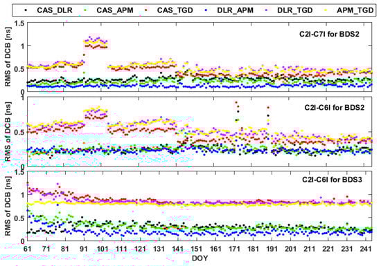 Root mean square (RMS) time series of the differences in BDS-based C2I-C6I and C2I-C7I DCB estimates between different solutions during the period of DOY 061–244 in 2020.