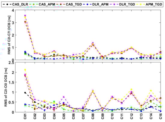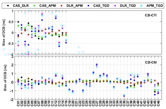 Since the two TGD parameters (TGD1 and TGD2) can be interpreted as C2I-C6I and C7I-C6I DCBs, the C2I-C7I DCB is, in theory, equal to the TGD1-TGD2 parameter. Considering that the TGD1 parameter for BDS2 and BDS3 might refer to the respective reference datum [19], the BDS2 and BDS3 DCBs obtained from different solutions were first normalized by a zero-mean constraint across the respective full sets of the BDS2 or BDS3 satellites before comparison. Additionally, because the DCBs obtained from different solutions may be calculated based on different BDS satellites, this section presents only the results for the common satellites. For example, since the DCBs for BDS3 GEO satellites (PRN C59 and C60) are not provided by the CAS and the DCBs for the PRN C60 satellite are not provided by the DLR, the statistical results do not cover these two satellites.