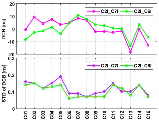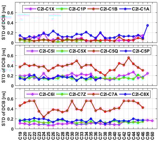 For evaluation of the stability of the BDS3 satellite-based DCBs, Figure 9 shows the monthly STDs of the BDS3 satellite-based DCB estimates of the signals among the different frequency bands. As shown in the figure, other than the C2I-C1A, C2I-C5Q, C2I-C5I and C2I-C7A DCB estimates, which exhibit large STDs, the STDs of the DCB estimates of the signal combinations are less than 0.2 ns. Similar to Figure 8 and Figure 9, the mean values and STDs of the DCB estimates of each BDS2 satellite are shown in Figure 10. The BDS2 satellite-based DCB estimates are confined to a range of ±20 ns. The monthly STDs of the BDS2 DCB estimates are mainly within 0.2 ns, showing better stability than those of the BDS3 satellites. In addition, because the signal quality of B3I is better than that of B2I [27], the stability of the C2I-C6I DCB estimates outperforms that of the C2I-C7I DCB estimates.