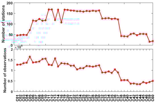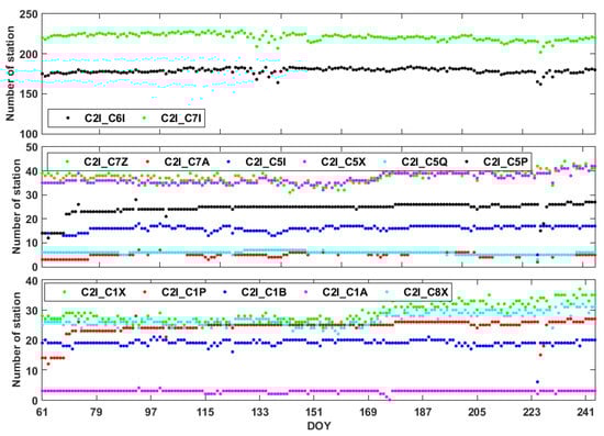 As shown in Figure 1, 246 globally distributed stations from the IGMAS and MGEX tracking networks were selected to perform the evaluation and analysis. The data sampling rate was chosen as 30 s. Table 3 summarizes the basic information of the tracking stations whose receiver types stayed unchanged during the period of DOY 214–244, 2020. The receiver hardware device information for stations whose receiver type or antenna type changed during the test period is listed in Table 4. Information on the BDS signals, including the signal frequencies, observation type and number of accessible stations, is listed in Table 5. Different colors used to denote stations in Figure 1 correspond to different receiver types in the first column, “Receiver type index”, in Table 5. As shown in Table 5, more than 180 receivers can track triple-frequency legacy BDS signals. The C7I signal can be tracked by the majority of receivers except the CETC-54-GMR, BD070 and GNSS_GGR receivers. Considering that the C2I signal can be tracked by all receivers, all DCBs estimated in this study are formed with respect to the C2I signal.