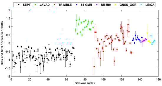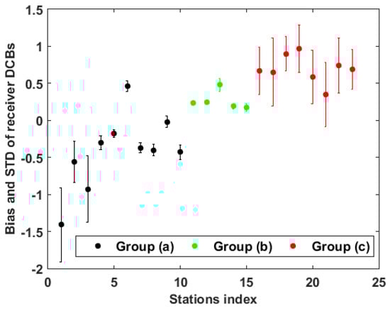 To further analyze the impact of the antenna type and firmware version on the bias between the BDS2 and BDS3 receiver DCB estimates, taking the receiver type of TRIMBLE NETR9 as an example, Figure 14 shows the mean differences and STDs of the receiver DCB estimates between BDS2-only and BDS2+BDS3 solutions for the selected stations in three groups equipped with the same types of receivers and antennas and firmware version configuration. Table 9 shows the information of the three groups of stations and the corresponding statistical results. There are obvious significant differences in the bias results between receivers from different manufacturers. In addition, the mean differences of the receiver DCB estimates between BDS2-only and BDS2+BDS3 solutions for receivers in the second and third group are all positive values, and those of the first group are almost all negative values. It may be concluded that the differences in receiver DCB estimates between BDS2 and BDS3 are related to firmware version and types of receivers and antennas, and the firmware version has a larger impact on the bias between the BDS2 and BDS3 receiver DCBs than that of the antenna type.