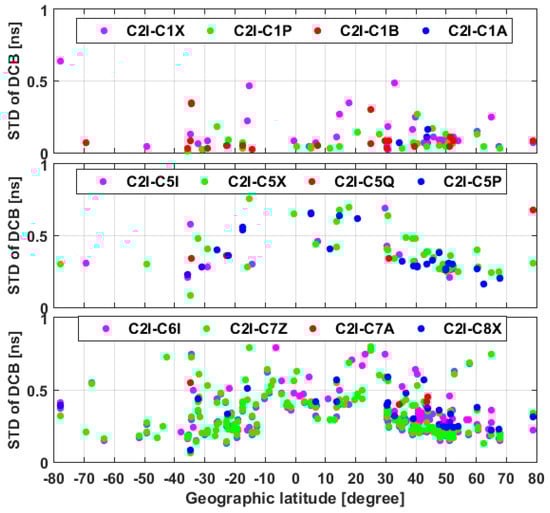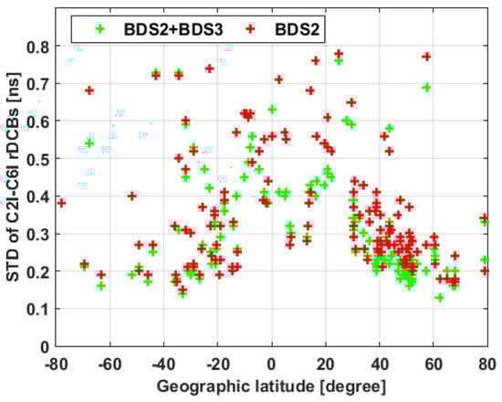 STDs of receiver C2I–C6I DCB estimates at each station. The stations are aligned by geographic latitude on the horizontal axis.
