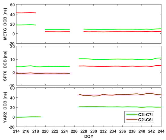 To study the impact of changes in types of receivers and antennas on receiver BDS DCB estimates, taking METG, SPT0 and YAR2 stations as examples, Figure 17 shows the time series of the receiver DCB estimates for the three stations during the test period. There are several gaps, due to discontinuous data or changes in the receiver hardware device. According to the information on the three receivers shown in Table 4, the receiver type for stations METG and YAR2 and the antenna type for station SPT0 changed during the period of DOY 218–227. The abnormal variations in receiver DCB estimates for the three stations are consistent with the changes in receiver hardware devices, from which we can conclude that the jumps are largely driven by changes in receiver type or antenna type. This justifies the impacts of changes in types of receivers and antennas on the variations in receiver DCB estimates.