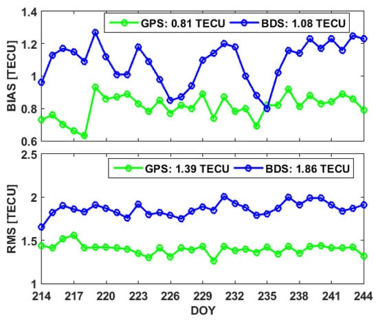 The bias and RMS series of the APM-based GIMs with regard to the combined final GIM products of the IGS during the period from DOY 214 to 244 in 2020 are shown in Figure 18. The figure depicts that the GPS-based GIM products provide better consistency with the IGS GIMs than do the BDS-based products. Taking the IGS-based GIM products as a reference, the accuracies of the BDS-based and GPS-based GIMs are 1.86 and 1.39 total electron content units (TECUs), respectively. Considering that the IGS-provided GIMs are calculated based on GPS and GLONASS data, the GPS-based GIMs are expected to be more consistent with the IGS GIM products than the BDS-based GIMs.