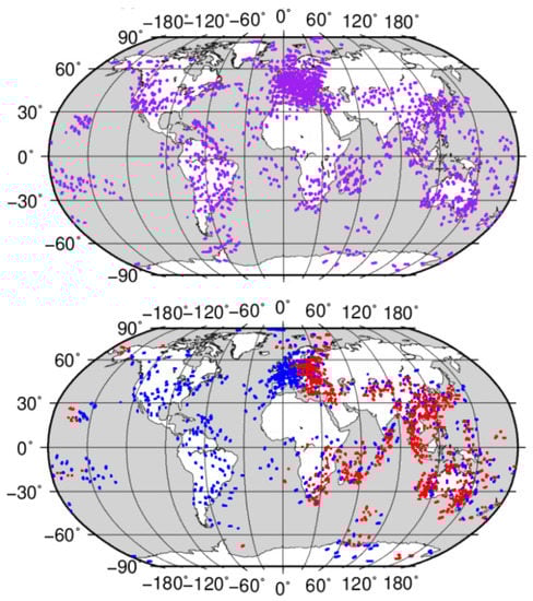 The even distribution of ionospheric observables is recognized to play an important role in high-precision GIM product calculations. To study the impact of IPP distributions on the performance differences between the BDS-based and GPS-based GIMs, the IPP distributions of the BDS- and GPS-based ionospheric observables for the first 15 min of DOY 214, 2020 are shown in Figure 19. The density of the IPPs of the BDS is significantly increased when BDS3 satellites are included. Although the distributions of the IPPs tracked by both GPS and BDS satellites can cover most of the continuous regions, the IPPs for the GPS are denser than those of the BDS in the oceans. Thus, the poorer IPP distribution of BDS can be regarded as one of the reasons for the degraded precision of the BDS-based GIMs.
