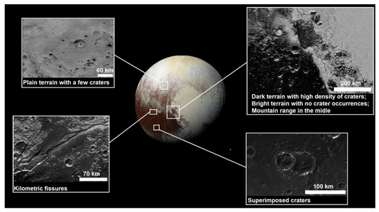Pluto, currently designated as a dwarf planet, is 5.9 billion kilometers from the Sun and is the main object of the Kuiper Belt. The study area comprises the region west of Sputnik Planitia (SP), between 0° and 180° longitude (Figure 2). In this area, images with the best spatial resolution acquired by New Horizons are found in a variety of morphologically distinct domains containing the majority of impact structures of Pluto’s surface [7,9].