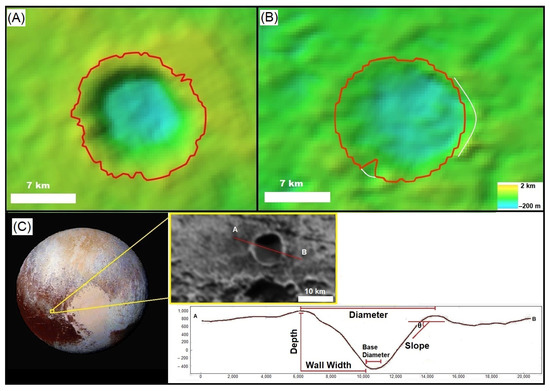 (A) Crater with a good outline. (B) Crater with some outline errors and, therefore, excluded from further analysis. The red lines represent the outlines processed by the Python code for two different craters, each one with different levels of success. White lines represent the ideal outline. (C) Profile of a simple crater on Pluto’s surface showing the data extracted by the Python code.