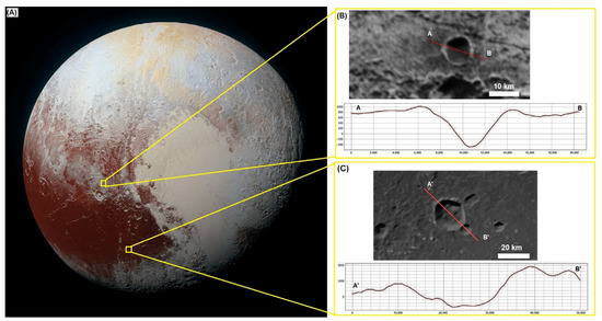 In July 2015, the New Horizons spacecraft imaged approximately 30% of Pluto’s surface [7]. Since then, some preliminary studies regarding the morphometry of its impact craters have been carried out, and the subject needs to be further investigated. According to Moore et al. [8], the New Horizons mission found out that Pluto’s surface is mainly composed of H2O, CH4, CO, and N2 ices. The dwarf planet has active geological processes and atmospheric cycles which still modify its surface in the present. Robbins et al. [9] identified approximately 5200 circular structures on Pluto’s surface and divided them into a five-point scale system, where one means little chance of being an impact crater and five indicates a certain impact crater. Robbins et al. [9] measured the diameter of each impact crater on Pluto to create a global distribution of impact frequency by size. A preliminary division of Pluto’s surface into morphological domains was presented by Moore et al. [8]. Robbins et al. [10] measured the depth and diameter of 113 craters on Pluto’s surface and deduced a global transition diameter of approximately 10 km.
