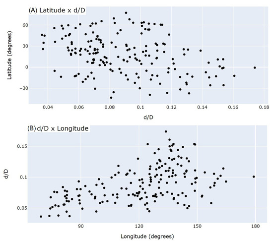 d/D ratios related only to freshest craters plotted according to: (A) latitude; (B) longitude.