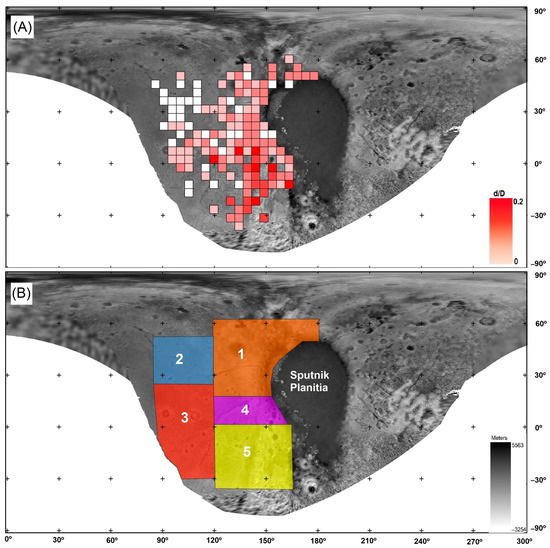 In order to better understand the variability of morphometry across Pluto’s surface, areas of common d/D patterns were grouped together, using Figure 5 and Figure 6, in five different regions (Figure 6B).