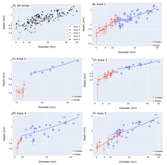 Depth vs Diameter plotted on log–log scale. Only the freshest craters of each area are considered. Data are divided into simple and complex structures. (A) all areas. (B) area 1 (C) area 2. (D) Area 3. (E) Area 4. (F) Area 5.
