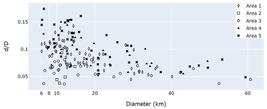 Figure 7A shows the measured values of depth and diameter for the freshest measured craters of all areas, while Figure 7B–F show the same data, but considering separately simple and complex craters within each morphological domain. Craters of areas 1 and 4 show a change of slope trend of the graph approximately in 10 km of diameter (Figure 7B,E). Craters within Area 3 and 5 (Figure 7D,F) show a change of trend in ~15 km of diameter. The lack of small craters (<12 km) in area 2 limits the comparison between this area and the others, but is possible to notice that the data collected in it shows that craters <12 km are considerable shallower than craters larger than 15 km.