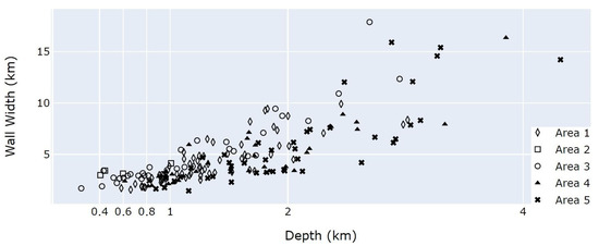 Assuming that the observed width and slope of the internal wall of the impact craters should increase as the craters undergo erosion and filling processes, Figure 9 relates wall width (Ww) with depth of the freshest craters of each area. It shows that craters of areas 4 and 5 tend to remain in the lower values of the plot. Other areas show a similar diversity of ranges for each depth value.