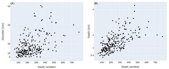 (A) diameter versus depth variation of all craters. (B) Depth versus depth variation of all craters. All craters plotted.