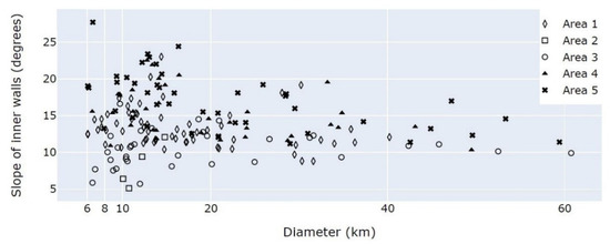 Larger craters tend to be formed earlier in the Solar System, so they accumulate more superimposed impacts and are affected by deformation processes for a longer period of time. On the other hand, smaller craters are more susceptible to these changes, so rim degradation and infilling by wall collapse would be more effective in reducing the d/D ratios of smaller craters (shallow ones) than the large (deeper) ones [21]. This pattern is shown in Figure 8, which depicts that craters with 10 km or less of diameter (taking into account the same terrain) have a greater range in the d/D ratio, which may indicate a higher rate of modification for craters in this size range. Figure 11 shows that smaller diameter craters tend to have a greater slope variability, which may show that the smaller the craters are, the more affected by filling or mass waste they are, factors that can decrease the slope of the wall. Larger craters do not appear to be so susceptible to decreases in the crater’s slope, which agrees with the work by White et al. [21].