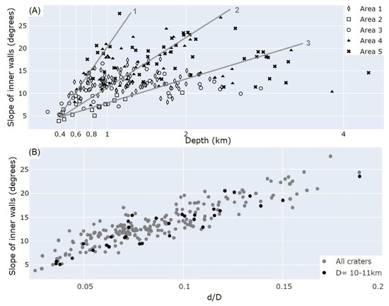 Figure 11 shows the relation of the slope of the inner wall (Sw) with diameter. Most of the craters are concentrated between 10 and 20 degrees of slope of the inner wall. Between 10 and 15 km in diameter there is a considerable presence of craters from areas 4 and 5 on higher slope values. Craters within areas 2 and 3, on the other hand, are concentrated in general in the areas of lower declivity of inner walls. Figure 12A shows a tendency of increasing Sw with depth. As we plot all craters in Figure 12A, it is possible to observe a higher spread of data as slope and depth values increase. To better understand this data spread, three different trends were defined in the chart (see Section 4 “Discussion”). Figure 12B shows a strong linear correlation of Sw and d/D ratios for all craters. The tendency of increasing Sw with depth is better observed when plotting only craters of the same diameter (10–11 km in Figure 12B).