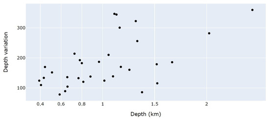 Figure 13 shows the relation of depth and the depth variation for a diameter of approximately 10 km. The plot shows a positive linear correlation between the two morphometrics variables. There are three points with large discrepancies (near 1 km depth).