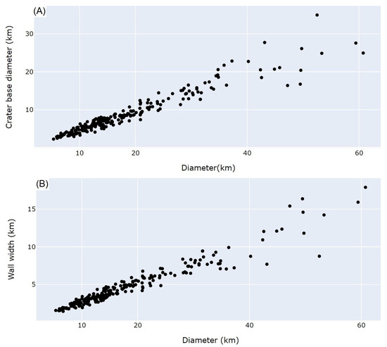 (A) Wall width versus diameter. (B): Diameter of base versus Diameter. All craters plotted.