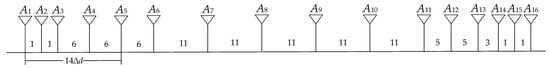 In order to ascertain the effectiveness of the above multi-parameter regularization approach, numerical simulation experiments are carried out on the full polarization interferometric radiometer (FPIR) system [26]. As a one-dimension SAIR, FPIR can only obtain the brightness temperature distribution of one strip in the cross-track direction, and then perform push-broom imaging in the along-track direction so as to get the two-dimensional brightness temperature image. The antenna array of the FPIR system, where the antennas A1, A2, …, A16 are sparsely arranged in different positions with a multiple of the shortest baseline ∆d, is presented in Figure 1. The specific system parameters are listed in Table 1. The simulated antenna patterns of the sixteen antennas are anisotropic. Moreover, the fringe washing function in Equation (1) is approximately equal to sin c (B ∆τ). After including the visibility function for the zero spacing V(0), the available number of complex visibilities is 241. When the brightness temperature map in the simulation experiment is sampled to 600 × 1, the size of the matrices G is equal to 241 × 600.