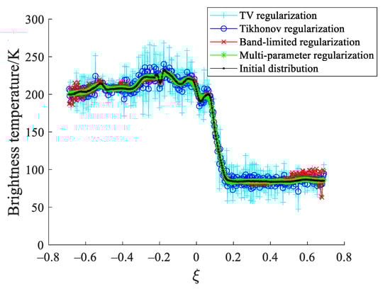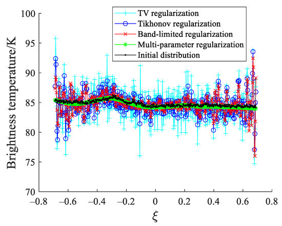 In recent years, multi-parameter regularization has drawn a lot of attention as a method to improve the performance of the regularized solution [14,15,16,17] and have been used in some areas such as inverse electrocardiography [18], deblurring images [19], dynamic light scattering [20], and force reconstruction problems [21]. Different from the single-parameter regularization, multi-parameter regularization adds multiple different penalties which can reflect multi-scale characteristics of the original solution. In this paper, the multi-parameter regularization method is presented to obtain the optimal brightness temperature map in SAIRs.