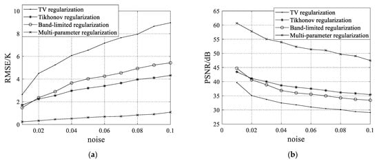 Furthermore, the performance (RMSE and PSNR) of the TV, Tikhonov, band-limited, and multi-parameter regularization with different noise levels is shown in Figure 8 to quantitatively analyze the sensitivity of the above reconstruction methods to the error and noise interference. The results indicate that compared with the TV, Tikhonov, and band-limited regularization methods, the multi-parameter regularization is more robust to measurement error and noise interference. This seems to suggest that the multi-parameter regularization can better improve the accuracy of reconstructing the brightness temperature distributions.